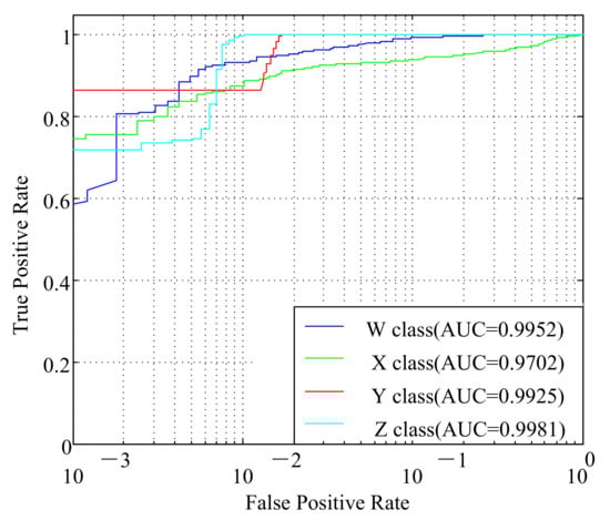 Figure 12 shows the ROC curve and the corresponding AUC value of the four types of signals. The horizontal axis uses a logarithmic scale to enlarge the ROC curve in the upper left corner. The ROC curves of the signals of W, Y, and Z are relatively close to the  point, and their classification effects are relatively good. However, the ROC curve of the signals of type X is closest to the 45-degree line, so the classification effect is worst. Judging from the AUC value, the AUC of the Z-type signal is the highest, which reaches . The AUC values of the W-type and Y-type signals have respectively reached  and . The AUC value of the X-type signal is only . Therefore, the classification effect of the X-type signal is also inferior to the other three types of signals.