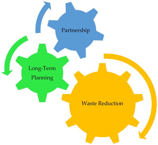 As shown in Figure 1, sustainable marketing (besides the traditional division into three dimensions: economic, social, and environmental) is based on three pillars. First, it reduces waste and hazards by, e.g., re-using carrier packages and advertising solutions (environmental dimension). Second, sustainable marketing encourages customers by partnering with them and cooperating with other partners (non-profit organizations, local authorities—a social dimension). Companies can rely on critical users and customers to promote and share information through social networking sites. Third, it should support long-term planning (mission of the organization, long-term goals, long-term plans of developing the operation, dissemination strategies, etc.—economic dimension).