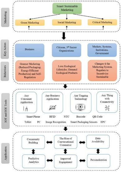 According to the proposed framework, the most key actors of green marketing are the business sector entities, including social marketing of the citizens, 3rd sector organizations, and critical marketing of markets, systems, institutions, and government. The importance of IoT and IoE tools leads to the development of sustainable marketing (e.g., any consumer application, any business application, any tagging technology, and anything with connectivity). They include many elements, both objects and technologies: smartphones, RFID, NTC, barcodes, QR codes, tablets, etc. Accordingly, the development of sustainable marketing [45] leads to the following results: