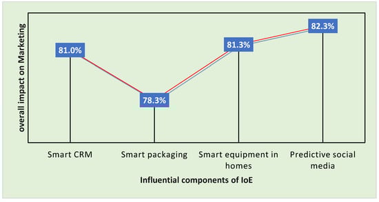 Additionally, as presented in Figure 3, there is a high impact of IoE technology on significant marketing activities. As can be seen, the average rate is above 75%. The values were obtained using data from interviews with experts. This value shows the high impact of IoE technology on the main parts of marketing and its sustainable development.