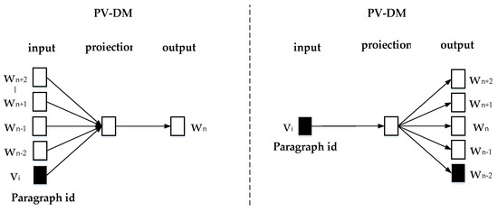 The Doc2Vec model with added paragraph attributes is proposed. The model has two prediction forms: PV-DM and PV-DBOW; as shown in Figure 2 PV-DM is similar to CBOW. The difference is that the PV-DM model needs to initialize a paragraph vector randomly. It also needs to predict the target word by averaging or connecting the paragraph vector with the word vector. PV-DBOW predicts context words through the input paragraph vector.