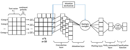 The convolutional neural network model with the attention mechanism is shown in Figure 4. Regarding the input of the CNN with the attention mechanism, the whole rumor event is divided into 20 groups by the time series algorithm. The text vector features and sentiment polarity features in different time series are obtained by the Doc2Vec algorithm and the SVM algorithm, respectively, (see Section 3.4 for details).