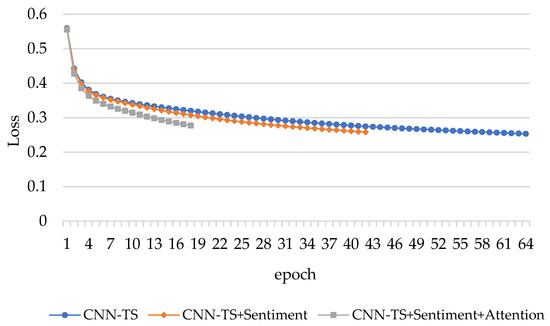 It can be seen from Figure 6 that the loss value of CNN-TS model proposed by J. Wang is reduced to 0.2530 after 64 iterations under the first fold data. In order to prevent overfitting, the model takes an early-stopping operation. The CNN-TS + Sentiment proposed in this paper only needs 42 iterations and the loss value reaches stability and stops training. The improved CNN-TS + Sentiment + Attention is more optimized. It only needs 18 iterations, after which the model stops training. Additionally, the loss value remains unchanged. This verifies the superiority of our model in training speed.