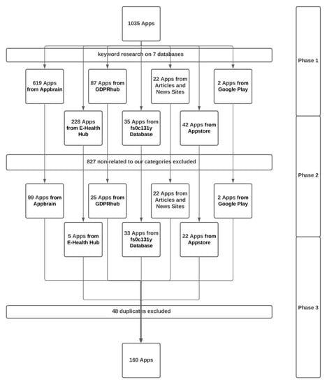 Coronavirus tracking and mapping is a key approach for LBMAs. A significant number of COVID-19 LBMAs from various international contexts have been collected and categorized taking into consideration a multidimensional analysis related to services, technology, societal and business, and legal aspects. According to our research design regarding seven online application databases (namely Appbrain, e-Health Hub, GDPRhub, Fs0c131y, News Sites, Appstore, Google Play), our study was conducted during the period March to June 2020 including worldwide relevant results and was updated in November 2020. Specifically, utilizing seven different research databases, we performed a systematic analysis by using a series of keywords such as “Covid19,” “Coronavirus,” “Corona,” and “COVID-19” []. We accessed results worldwide by utilizing Virtual Private Network (VPN) to overcome geographical restrictions. The full names of the mobile applications (found in Appendix A) were in some cases translated from the original language into English so that they can be presented accordingly in Appendix A. Following three-phase selection criteria (depicted in Figure 2) and expert analysis, the mobile apps relevant to our research were reduced to 160. 79 of these apps were categorized as Health Status apps, 46 as Preserving Contact Tracing, 23 as COVID-19 Spread Mapping, 4 as COVID-19 Geosocial Media, and 8 as multipurpose apps [].