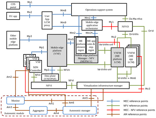 DSDVMEC dimensions the allocated resources as VNFs that run the SDN controllers and their allocations depend on the amount of requests from vehicles which are periodically monitored. This way, it is proposed an autonomic module in charge of self-management of the architecture through orchestration and resource optimization regarding the VNFs. To reduce the integration complexity and overload of existing functional blocks of the ETSI MEC reference architecture with NFV support [52], the autonomic module consists of three new functional blocks, namely, monitor, aggregator, and autonomic manager, besides four reference points, described as follows: