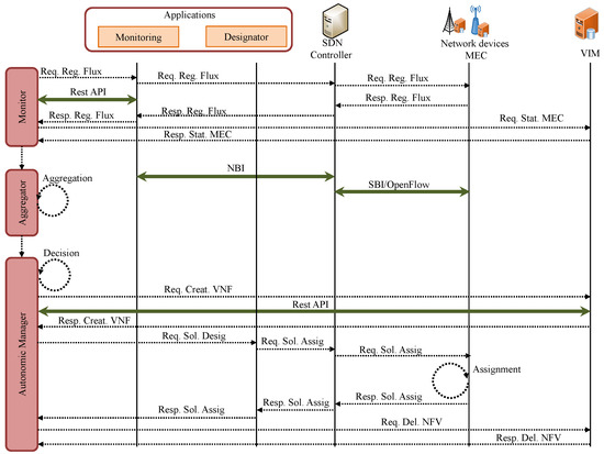 Then, the message Req. Stat. MEC is sent to the VIM indicating the request to use the computational resources of VNFs hosting the SDN controllers. The response message Resp. Stat. MEC is sent back to the Monitor.
