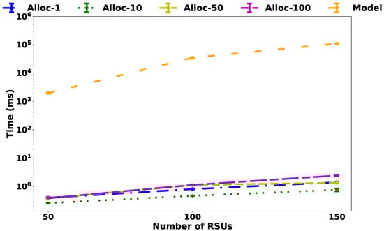 Considering the dynamic aspect of the VANET environment, it is essential to understand the trade-off between the required time to deploy the SDN controllers into the MEC and the effectiveness of the achieved solution for both the exact model and the heuristic. As shown in Figure 9, as the scenario increases from 50 to 150 RSUs, the exact model becomes intractable, as it requires more than ms to obtain the optimum solution. On the other hand, as shown in Figure 10, in a scenario with 15,000 RSUs, the heuristic requires less than ms for = 1. In addition, as the parameter increases to 100, the time reduces to ms. The results show that to decrease the heuristic execution time, it’s necessary to adopt with higher values, aiming at reducing the number of template selection tasks for the controllers. However, in the specific case of set to 50 and 100 with 15,000 RSUs the values are similar. This fact can be explained by the number of drivers created, considering that more time is required to process the heuristic by creating new drivers than assigning RSUs to existing drivers.