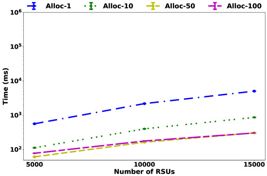 The main goal of this experiment is to verify the applicability of using such heuristic for real-time decision-making in high-density scenarios. For both scenarios, the parameter assumed the values 1, 10, 50, and 100. The RSU coverage radius was set to 250 m. Considering the capacity of the controller as ∼7500 requests per second [37], we adopt the templates capacities as 100, 500, 1000, 2000, 4000, 8000, 10,000, 12,000, and 15,000. The vehicles’ density was chosen randomly within the interval [0, 250] vehicles/km as in [53]. For all experiments, the resource reservation parameter is set to 10%, and the graphs plotted with a confidence interval of 95%.