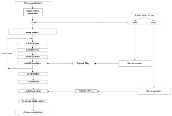 The 128-bit length of the LAES key keeps the design persistent in terms of the agent’s brute force attack, in comparison to the smaller key size used in previous studies [32,35]. The key is divided into two halves, each of which is a 64-bit 4 × 4 matrix. Each entry in the matrix consists of 4 bits, instead of the 8 bits in AES.