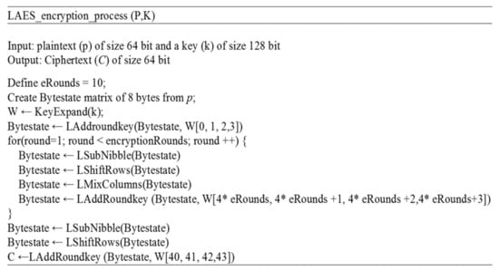The main transformations components of LAES encryption rounds are mainly inherited from the original AES; however, the AES encryption components operate on GF (28), while the LAES encryption components operate on GF(24). This means that the components of the LAES operate by following the same logical operations of the AES, but the entries of each component are completely different, and operate on a smaller scale. For example, the S-box in the AES is a lookup table of 256 entries, while the S-box of the LAES is a lookup table of 16 entries. The input to the encryption process is a block of 64 bits, and it is reshaped into 4 × 4 matrix. This matrix is called a state matrix, which is modified based on the encryption rounds until the 10th round of the encryption is completed. The first nine rounds of LAES consist of four transformation components: LSubNibble, LShiftRows, LMixColumns, and LAddRoundKey. The final round of LAES contains only three transformations components, similar to the AES, which are LSubNibble, LShiftRows, and LAddRoundKey, as described below.