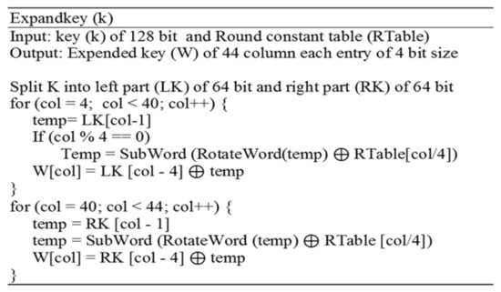 The left part of the key consists of 64 bits arranged into a 4 × 4 matrix, where each entry has 4 bits. The matrix is then expanded by joining 40 more columns. Considering that the initial values of key columns are C (0), C (1), C (2), and C (3), the new columns are defined as in Equation (4).