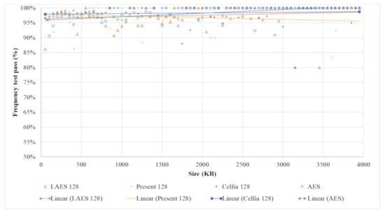 Figure 4 displays the rate of success for frequency testing obtained from the cipher output of LAES 128, Present 128, Clefia 128, and AES on various sizes of files. The x-axis identifies the success rate for each cryptographic algorithm on a specific size of the file, and the y-axis identifies the file size. It can be seen that very good randomness properties were exhibited by all of the algorithms, with success rates generally ranging between 80–100%. The trend lines for the LAES and its counterparts also show anticipated performance for cryptographic algorithms that are supposed to produce a random cipher (to avoid exposing confidential information), which could be useful for undesired cryptoanalysis. It can be seen that the percentage of success increased with a larger file size, which is attributable to the statistical features of the test, which is directly affected by the large number of sequences generated from larger file sizes (which usually have a higher volume of chaotic data).