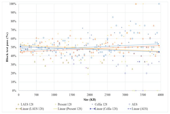 Figure 5 shows the block test success rate achieved by LAES 128, Present 128, Clefia 128, and AES on files of different sizes. The x-axis identifies the rate of success for each crypto algorithm on a specific size of file, and the y-axis identifies the size of the files. Figure 5 shows that the randomness trend lines for the algorithms are above 40%. The trend lines for the LAES show a higher success rate for larger files, almost similar to the AES trend line. This indicates that despite the higher number of rounds in the LAES counterparts, it was able to produce a higher degree of diffusion on files consisting of a higher number of blocks.