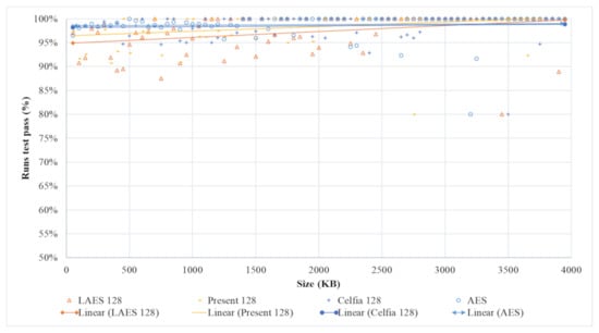 Figure 6 shows the runs test success rate obtained from the cipher output of LAES 128, Present 128, Clefia 128, and AES on files of various sizes. The x-axis identifies the success rate for each crypto algorithm on a specific size of the file, and the y-axis identifies the file size. The figure shows very good randomness outcomes for the algorithms, and success rates ranging between 80–100%. The trend lines for LAES and its counterparts show very close success rates.