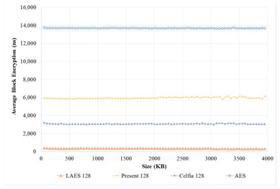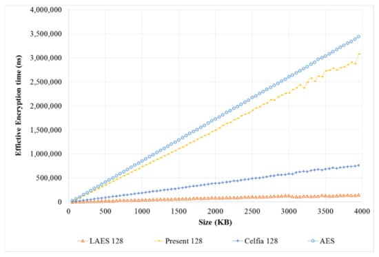 The time efficiency of LAES and its counterparts were measured using three metrics, as shown in Figure 7, Figure 8 and Figure 9. Figure 7 shows the effective (total) encryption time achieved by LEAS and its counterparts. It illustrates that the encryption time of LEAS increases modestly with file size, but in contrast, it increases exponentially for Present and AES. This behavior is attributable to Present having a large number of rounds (n = 31). While Celfia demonstrates a lower encryption time than Present, the lowest encryption time was achieved by LEAS, with an average difference of 79.7%, 95.0%, and 97.4% lower than Celfia, Present, and AES, respectively. These outcomes also conform to the outcomes displayed in Figure 8, indicating the required encryption time for a single block.