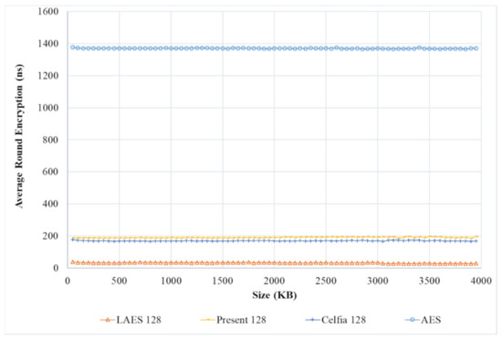 Figure 9 shows the encryption time for a single round achieved by LEAS, Present, Celfia, and AES. LEAS evidently outperforms both Present and Celfia regardless of file size, with an average difference of 79.8% and 82.7% lower (respectively). This is due to the deceleration propagated from the key generation process in Present, and the bit permutation method it uses. Celfia also shows relatively slower round encryption time compared to LAES due to its internal structure, which is based on a generalized Feistel structure, with four data lines having two 32-bit F-functions per round (comprising two different 8-bit S-boxes), followed by a diffusion matrix multiplication [35]. This elaborate process slows down Celfia compared to LAES.