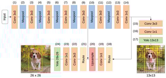 A shortcut layer skips one or more layers by adding an output feature map of a previous layer to a current layer. Routing and upsampling layers are usually associated with objection detection [15]. The routing layer concatenates outputs from different layers creating stacked separate output channels. The upsampling layer increases the size (width and height) of a feature map to detect objects at different scales and obtain more information from features identified in the input map. The simplest upsample method consists in repeating each value in an feature map four times in a square.