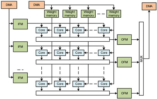 The computing cores are organized in a two-dimensional matrix to enable intra- and inter-parallelism, as discussed in Section 2.4. Cores in the same line receive the same input feature map but different kernels. Cores in the same column receive the same kernels but different input feature maps.