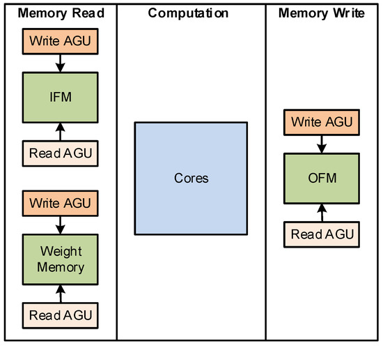 The dataflow of the accelerator is divided into three phases: memory read, compute, and memory write, as is presented in Figure 3.