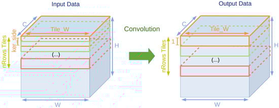 Loop tiling is used if the input data in deep CNNs are too large to fit in the on-chip memory at the same time [34]. Loop tiling divides the data into blocks placed in the on-chip memory. The main goal of this technique is to assign the tile size in a way that leverages the data locality of the convolution and minimizes the data transfers from and to external memory. Ideally, each input and weight is only transferred once from external memory to the on-chip buffers. The tiling factors set the lower bound for the size of the on-chip buffer.