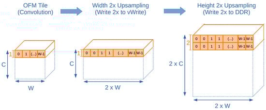The convolutional layer 19 is paired with the following upsample layer. Figure 7 summarizes the upsampling process from the OFM tile calculated by the regular convolutional configuration.