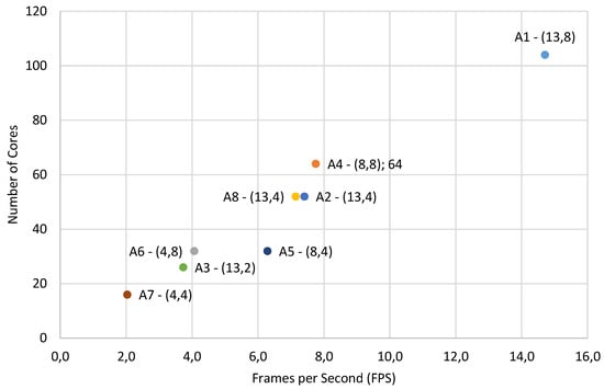 The number of cores versus frames per second of each configuration of the architecture. The graphs indicate the configuration as number of lines of cores and number of columns of cores).