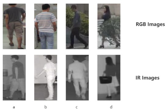 For RGB–IR Re-ID [], cross-modality discrepancies and intra-modality variations are two problems that urgently need to be solved. Cross-modality discrepancies are due to the different imaging principles of RGB cameras and IR cameras. In Figure 1, the IR images in the first row were taken with an IR camera at night and only contain a single channel of heat information; the RGB images in the second row were captured by an RGB camera under good lighting conditions and contain the most important three-channel color information related to pedestrian appearance. As a result, color information that is very important in RGB-RGB Re-ID cannot be used in RGB–IR Re-ID. However, similar to those in single-modality Re-ID, intra-modality variations are caused by multiple factors, such as changes in perspective, person posture and lighting conditions. These issues make RGB–IR Re-ID extremely challenging.