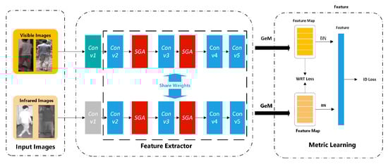 Feature Extraction. The model in this paper uses a dual-path convolutional network architecture to learn feature expressions through partial parameter sharing to resolve modality differences at the feature level, as shown in Figure 2. Inspired by [], the RGB and IR images of the same person are different based on low-level features but the same when middle-level features are considered. Thus, the dual-path network architecture in this paper does not share the parameters of the first convolution block to extract low-level features of a specific modality, and the convolution block of the deep network learns the shared mid-level features of the two modalities through shared parameters. After feature extraction, GeM pooling is used to obtain additional feature information. Compared with other dual-path architectures, this kind of backbone network can better mine the intermediate feature information and obtain more features for identification. The SGA module proposed in this paper plays a key role in extraction, and we will introduce this module next.