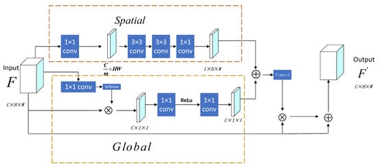 Global Attention Branch. In this paper, the global attention [,,] mechanism uses global contextual information to recalibrate the weights of different channels and adjust the channels’ dependence levels. In general, this mechanism can be summarized into three steps: (1) context modeling, (2) feature conversion, and (3) feature fusion. For the input feature set , 1 × 1 convolution and the softmax function are first used to obtain attention weights; then, the original input features are fused to obtain global context features. We use to represent the features obtained by completing context modeling. The corresponding calculation is as follows: