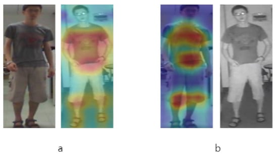 Figure 4 illustrates the key area for the four pedestrian images of one person. In the RGB–IR person Re-ID, the information such as color and face cannot be used, so the upper limbs and lower limbs of the human body are the most critical features. As shown in Figure 4, our network is more interested in these discriminative parts. This proves the SGA module proposed in this paper focuses on the key parts of the input image to obtain robust feature.