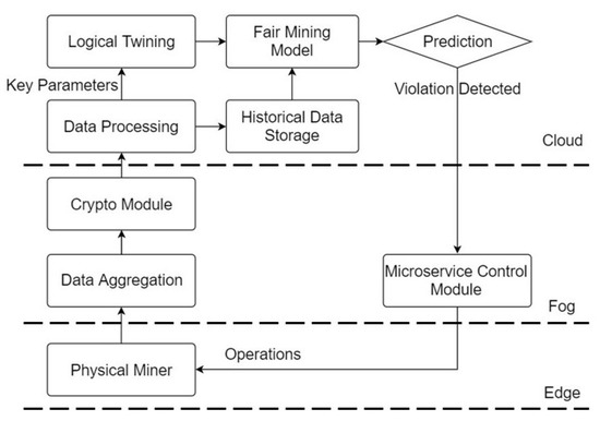 Figure 2 illustrates the workflow of the fair-mining mechanism in the MinT system. The upstream data flow starts from the containerized miners and aggregates the fog servers installed with different modules. The fog server first normalize the data from all physical miners, which reports to it under its jurisdiction. The fog server can either construct logical miners that mirror these new physical miners or update the status of existing logical miners. The fog server further encrypts its local logical twining miners and forwards them to the cloud.