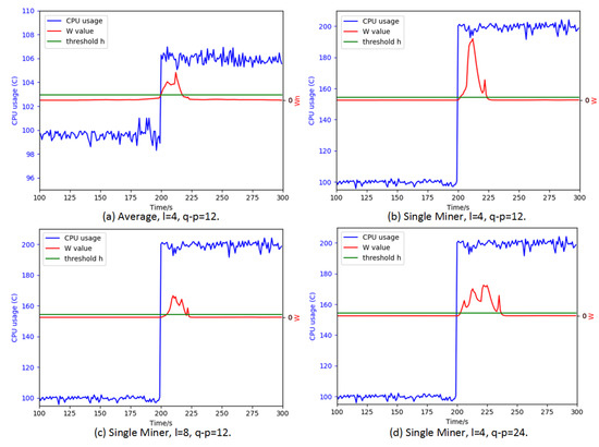 As the PoW algorithm is executed on CPU, samples of the key parameter C are collected and the historical data vector is used to obtain the statistic profile, where and . For SSA based change-point detection, as the standard SSA recommendation in the book [47], we define according to the size of the data sets, to the half size of N, , and . We deliberately set so that the base and test matrices would not coincide. After visual inspection of the components of the decomposition of the whole time series, we choose certain l to represent ignoring the noise components. To guarantee the accuracy and reliability, we repeat each experiment scenario for at least five times and over two hours each time to avoid contingency.