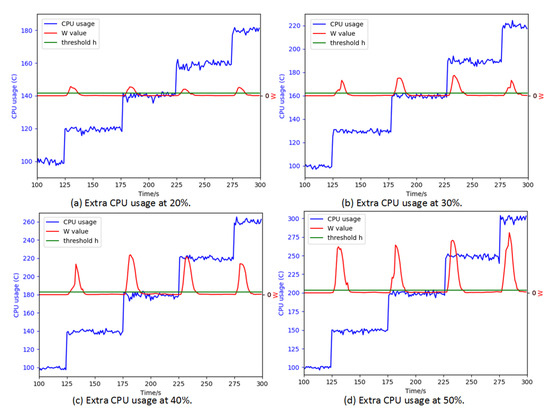 The second scenario considers more stealthy behavior of a violator, which increases the computing power slowly, from 20% to 50%, taking multiple steps at time point s, s, s and s. Figure 4a shows the detection results in which a miner increases 20% CPU usage at each time point. Figure 4b–d show similar results of cases when the CPU usage increases by 30%, 40% and 50% respectively. Obviously, the SSA-based anomaly detection is able to detect the changes in the structure of the time series data and to identify the corresponding violation on mining power. However, the critical issue is how to select a threshold to ensure a high detection accuracy and to minimize the false-positive/negative rates.