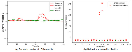 We take an observation of 20 min on the 16 miners running at 100% of the assigned system resource. Two of the miners act as the byzantine (dishonest) workers, which would gain extra 10% at the 9th and 10th min. As shown in Figure 5a, the behavior vector B from dishonest workers varies from honest ones when the byzantine workers gain more computing power. During the two minutes where violation occurs, the resulting consensus scores associated with the byzantine nodes are much larger, as shown in Figure 5b.