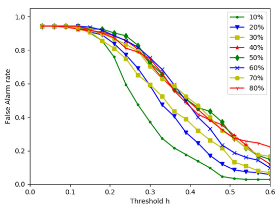 The fourth scenario is designed to mainly test the false positive rate from the network level observation at the fog server with different threshold settings. Figure 6 shows the false alarm rates when two of the sixteen miners gain extra system resources from 10% to 80%. The false alarm rate is calculated by comparing the averaged the W value with the threshold h. When we decrease h from 0.6 to 0.03, the false alarm rate increases rapidly at the beginning and then slowly approaches one. With the increasing percentage of the computing power the dishonest miner gains, the false alarm rate grows.