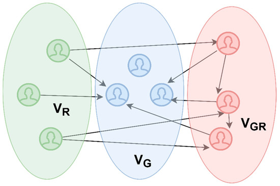 where means all the users who took part in the discussion, are the users who only generated content in the discussion , are the users who only reacted to the content in discussion , and are the users who both generated content and reacted to other content. Furthermore, refers to the connections that represent likes, comments, or reposts between the discussion participants. Visual representation of a networked discussion split by participation type according to (1) is presented on Figure 1.