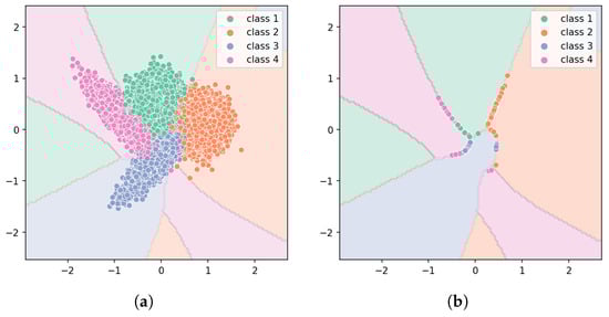 (a) Simulated latent samples; (b) On-manifold adversarial examples in the latent space. The distribution of simulated latent vectors (a) and the distribution of generated on-manifold adversarial examples with the simulation dataset (b). Each color represents a different class. The same number of examples (17,500 examples) are sampled from each of the four classes. We observe that on-manifold adversarial examples sit near the true decision boundary.