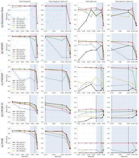 The test results on five datasets (simulation dataset, MNIST, FMNIST, CIFAR-10, and HAR) tested with the original testset and adv-on testset according to the model sparsity rates. The color of each line indicates the different model compression method. The light gray dotted-vertical lines indicate the optimal compression rate at the maximum point that regularly compressed models maintain above of the original accuracy. We can confirm that MC-AT(on) effectively handles the test accuracy of original examples and on-manifold adversarial examples in all five dataset, especially with high model compression ratios.