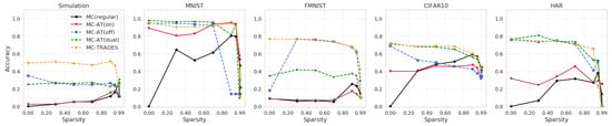 The off-manifold adversarial test results on five datasets (simulation dataset, MNIST, FMNIST, CIFAR-10, and HAR) according to model sparsity rates. The colors of each line indicates the different model compression method. Overall, in the high compression ratio section, MC-TRADES shows the most stable performance in overall datasets, and MC-AT(dual) shows more stable accuracy compare to MC-AT(off) in the high compression ratio section of or more.