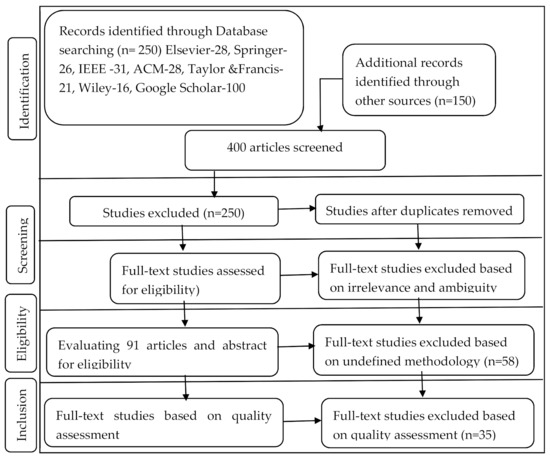 The approach adopted during the search process includes identifying databases, choosing keywords, and then defining the search strings by specifying the inclusion and exclusion criteria. The study identified 400 articles, and 58 of these were selected, and after further screening, we settled for 35 articles that meet the objective of the study.