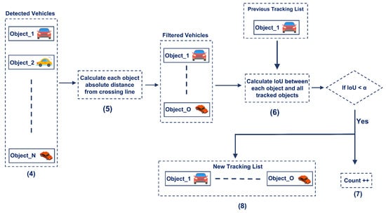 Some objects might stand within a distance less than the predefined threshold for more than one frame due to congestion or other reasons, due to which redundancy in counting objects occurs. To overcome this issue, this study integrates IoU concepts in the proposed system. Each counted object must be known to the system so that it is counted once. The only possible way is to track every counted object until it moves away from the crossing line by the threshold value.