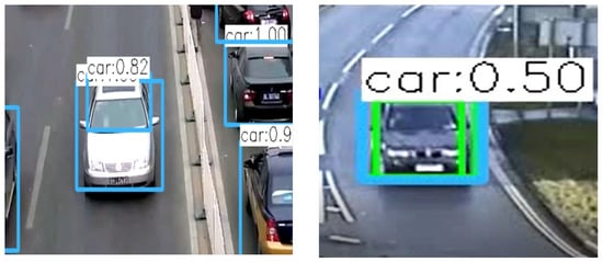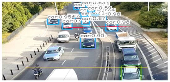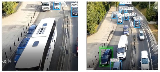 Based on the test results summarized in Table A1, it is evident that accuracy is not influenced by the object density feature. The main reason behind this inference is the selection of the appropriate position of the crossing line. The proposed system detects objects in the entire frame, but it tracks the counted objects for the predefined region only. Though the video frame has a large number of objects, the algorithm selects only the objects within the search region. The number of the objects in the search region is at the most equal to the number of road lanes because the algorithm is continuously updating the tracked objects list by removing old objects. In rare cases, YOLO might visualize a single object as dual objects illustrated in the left image Figure 5. However, this is an object detection problem, and cannot be linked to a high object density environment. The percentage of accuracy remains the same in both high-density and low-density environments. In the dataset, video number 10 depicts the low-density environment, and video number 12 illustrates the high-density environment. The difference in the accuracy between video 10 and video 12 is negligible and the accuracy achieved by both is more than 90%.