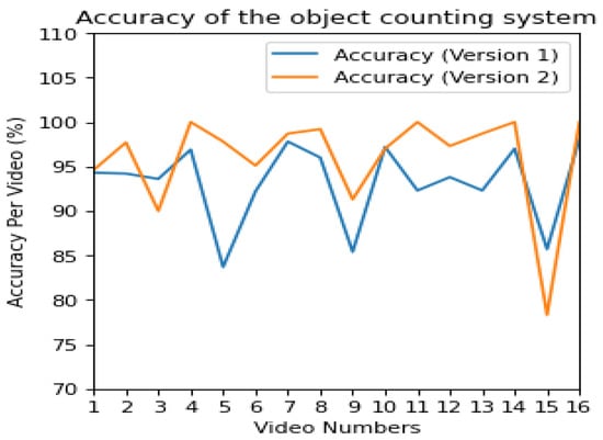High-speed object motion has a marginal impact on the accuracy of the proposed algorithm. Video number 3, and video number 12 are examples of high-speed environments, with accuracy above 90%. Video number 9 and video number 15 depict less accuracy. The reason behind tracking failure in the CSRT tracker is due to the presence of more objects which move slowly. In low-speed environments, CSRT tracks each counted object for a long duration, compared to high-speed environments. The right image of Figure 6 exhibits tracking failures, which are caused by the redundancy in counting similar objects due to low-speed motion. From the results displayed in Figure 7, it is evident that the inclusion of CSRT tracker YOLO version 5 has improved the accuracy of the object counting over the KCF tracker and YOLO version 2 used in version 1.0 [9].