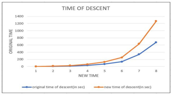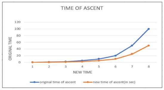 All the above graphs are made concerning time. As you can see from Figure 5, Figure 6 and Figure 7, there is a rate of increase in efficiency in both the ascent and descent. Additionally, from the value of Table 1, Table 2 and Table 3, it is proved that if we apply the above system and include the changes in the present system, the time can be decreased by a significant factor. The graphs show that the traditional approach fails with the medium, i.e., when the medium moves from land to air, a new system is required, which provides a much better result. The graphs also indicate that if we apply for the whole journey, the UAVs have a much higher chance of completing the task than with the traditional approaches as it reduces one of the most limiting factors, i.e., the power factor. With power being used more efficiently, it can cover a greater distance using the same amount of power and thus increase the area of reach and number of tasks at any particular time.