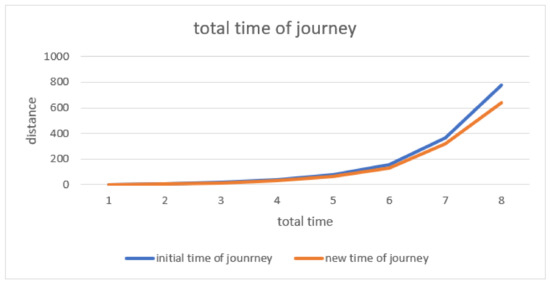 In Table 1, Table 2 and Table 3, below, we calculated the time of the original path and after on the modified path. Our research shows that if we can follow the path, the time optimization and thus the output of these UAVs can be increased for better usage of resources and better output. The efficiency is calculated by Equation (4):