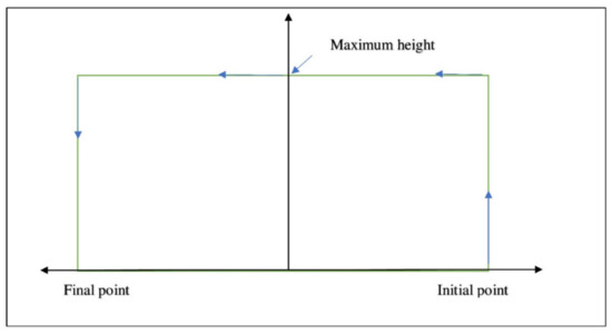For comparison, the path is taken to be a rectangle (2D) or a cuboid shape (3D), where the drone first follows a straight-line path to reach the maximum height and then to reach the destination as shown in Figure 7. It means that first there is a change in the y-axis or height only and then after reaching the maximum height, the drone moves forward.