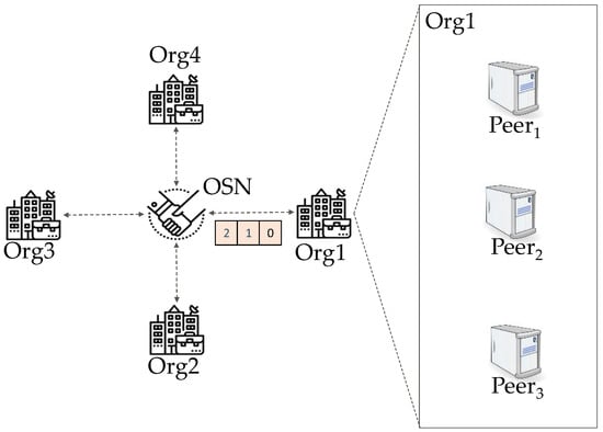 Hyperledger Fabric is a popular open-sourced permissioned blockchain system. In a permissionless blockchain system, the fundamental components (e.g., consensus algorithm and block generation rules) must be pre-determined before the system starts to provide services, since each node in a blockchain system must obey the same rules. If a change is needed after the blockchain system begins to run, the so-called “fork” [] operation is required. On the contrary, components in HLF are modular and pluggable. Provided the stakeholders reach a consensus, changes to the system can be easily realized. The nodes in HLF networks are divided by their different functions. The nodes that are responsible for saving blocks and answering query requests are called peers, some of the peers are also obtained to carry out the calculations defined in the transactions, these peers are called endorsers. The peers in the network always belong to different organizations: each organization represents one or several stakeholders in the real world. The nodes that are responsible for ordering the transactions and packing them into blocks are called orderers, it is recommended that each organization deploys one orderer to represent the organization. The orderers provide ordering services together follow certain consensus algorithms such as Raft [] or PBFT []. The orderers are referred to as Ordering Service Nodes (OSN). Figure 1 illustrates the structure of a typical HLF network.