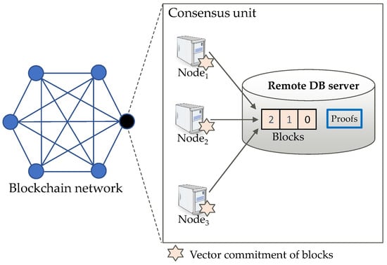 To relieve the storage burden for blockchain nodes, we focus on reducing the size of the chain of blocks since it alone is responsible for most of the storage burden of a blockchain node. Figure 2 shows the system architecture of our solution. An off-chain solution within each CU is used to achieve lower network overhead compared to on-chain solutions or solutions without adopting CU [] or solutions without adopting CU [,,,]: an off-chain remote DB server for each CU is added to store the blocks; VC is used to ensure the integrity of each transaction in a block stored in the remote DB server. Although the blocks are stored in the remote DB server, the nodes still maintain their local databases respectively and still be able to check the data integrity of the blocks that they transmit to the remote DB server, thus the decentralized character and tamper-proof character of blockchain system are retained.