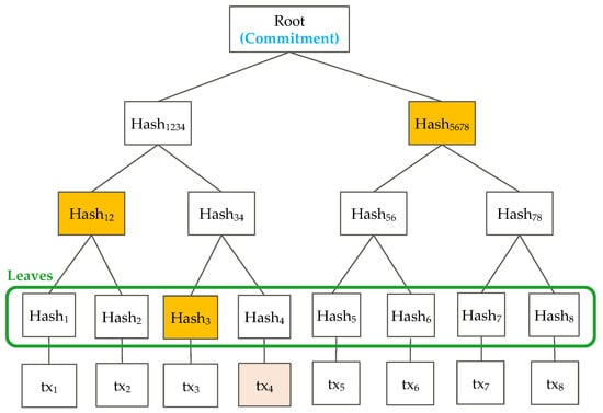 A Merkle tree [] is used to generate VC for the set of transactions in a block and proofs for the transactions. As shown in Figure 3, the hashes of the transactions in a block form the leaf nodes of the Merkle tree, the root of the Merkle tree is considered to be VC (C) of the block (7). When the proof of the transaction is requested, the list which includes adjacent sibling nodes of the corresponding leaf and its ancestor nodes is returned as the proof (8), in Figure 3, the list (shown in yellow) is the proof of transaction .