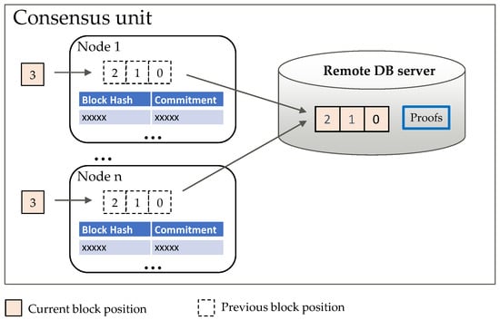 Before a block is transmitted to the remote DB server, the commitment of the block is generated and the indexDB of the peer is updated, so that the peer can retrieve transactions and blocks from the remote DB server after transmitting the blocks. A comparison of contents in indexDB before and after the update is provided (Table 1).